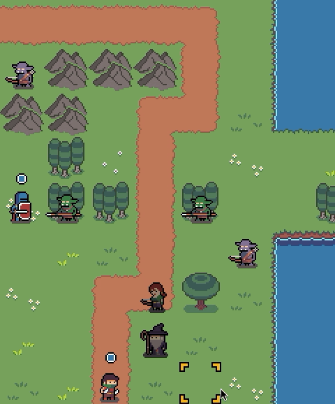 I think having different types of tiles is important in a tactical turnbased game since it makes positioning more “complicated”. The most common way of doing this is to give different tiles different bonuses/penalties: forests have +1 defense while hills increase the range of attacks or something like that (this is in the game already). Another way is by setting a movement cost for different units and tiles. In Fire Emblem for example, units on horseback have a harder time crossing forest tiles. I wanted movement to be impacted somehow but I’ve never been a fan of the “movement cost” approach since I feel it’s too fiddly so I needed to try something a bit different. Enter roads. A unit beginning their turn on a road can move their distance OR move freely on roads until blocked by an enemy. This allows you to move great distances. To mitigate this a bit I added a defensive penalty on roads which makes units on roads very vulnerable to damage. Here’s an example: