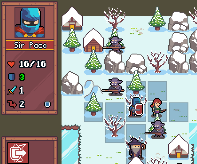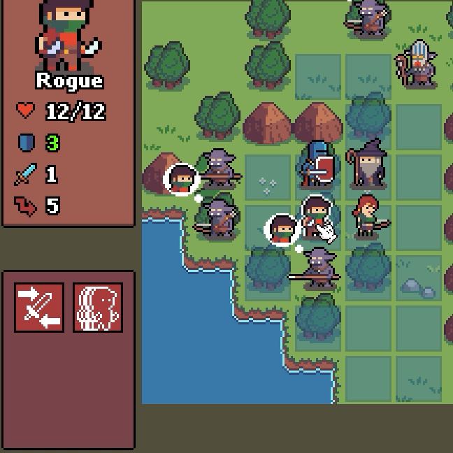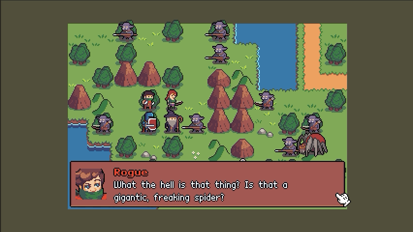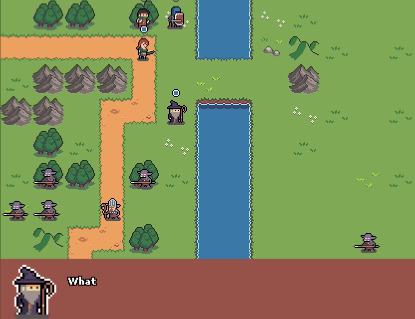 My first pass with the dialogue was just to mess around and see if I could get something in place but now I wanted to improve this and make something similar to Fire Emblem: characters talking in the beginning and end of the missions and in certain order. I added a dialogue array in the JSON for the level and now it’s all tied to the level. When the level is loaded the dialogue is presented in the correct order. On top of that I added some code so you can speed up the talking and also click to get to the next talking character. Here’s an example: