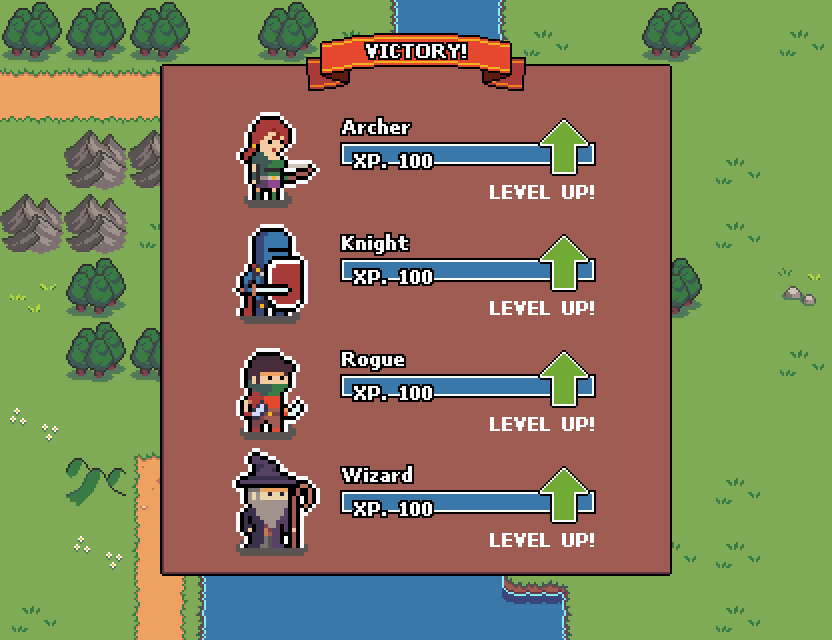 I still haven’t finished the level up screen but working on it revealed some other areas that needed work and it forced me make sure that I can save/load the heroes to move between levels and scenes. After tweaking some code and fixing bugs I now finally have a game loop!