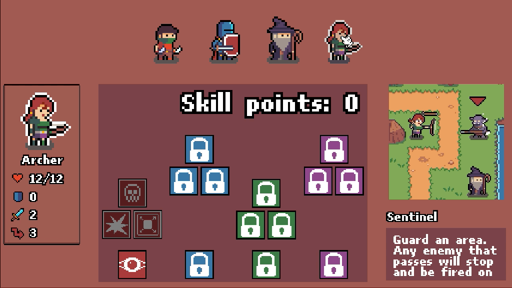 The game loop for the demo is now in place and working! You get a mission and once you complete it you are shown the victory screen (something needs to happen when you lose too which is NOT in place :P) and after that a skill tree where you can select upgrades for your heroes is presented. After that a new level begins. Simple and reliable. As I’ve mentioned before this structure will not remain in the final game but is a pretty fast way for me to get something out of the door “quickly” for feedback. Still have to design levels though so the DEMO itself is not done just the structure.